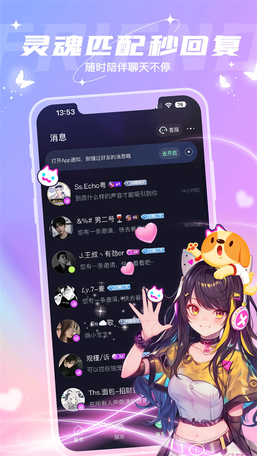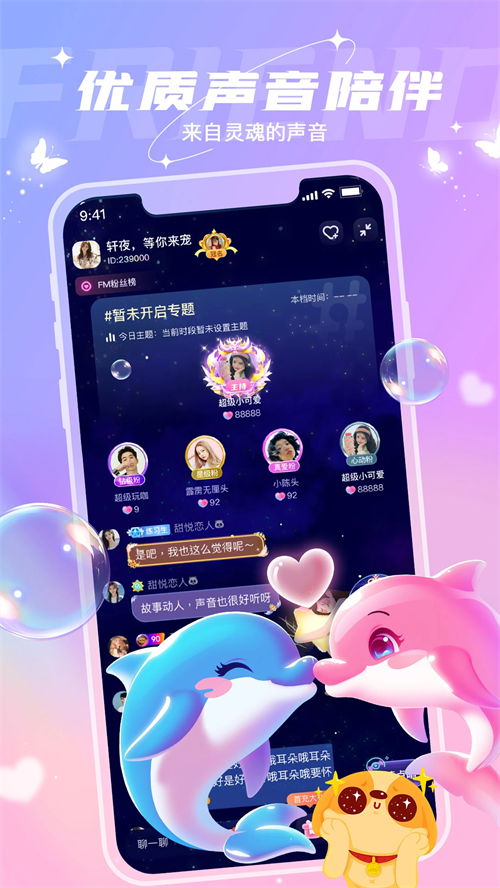多人语音聊天室,通过声音结识更多有趣的灵魂。不同语音聊天室满足,游戏陪玩,语音连麦、恋爱相亲、配对处CP,甜蜜电台,年轻人的爱聊派对就等你来。