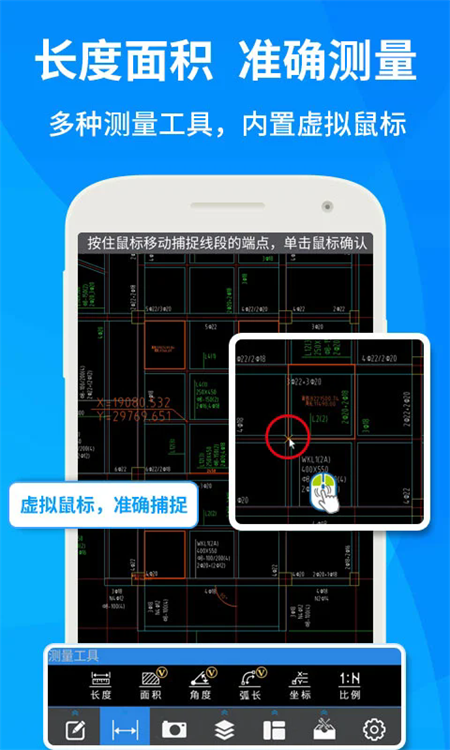 答:测量的时候手指在屏幕上长按2-3秒,待出现模拟鼠标、捕捉以及放大镜之后开始测量。