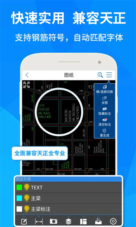 CAD快速看图手机版免费版是一款专业实用的手机CAD工具,这款软件为用户提供了快速看图、图纸标注、图纸测量三大功能,不仅支持AutoCAD所有版本的DWG图纸,软件还为用户准备了提取文字、异形面积、模板面积、连续测量等多种功能,辅助用户快速且准确的计算出坐标和尺寸,有效提高办公效率,能够很好的缓解了日常工作生活中的燃眉之急。