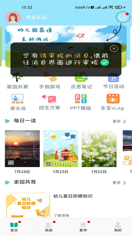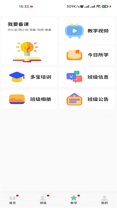 多宝课堂教师版是一款专为幼儿园教师打造的手机儿童教学软件,这款软件依托于多宝乐园信息化游戏互动课程,能够帮助教师在手机端查看游戏互动课程,并且软件覆盖了幼儿园托班、小班、中班、大班全学段,为教师提供了家园共育、教育教学等丰富的课程内容,能够辅助教师更好的展开教学,确保每一位幼儿都能够获得全方位的提升。