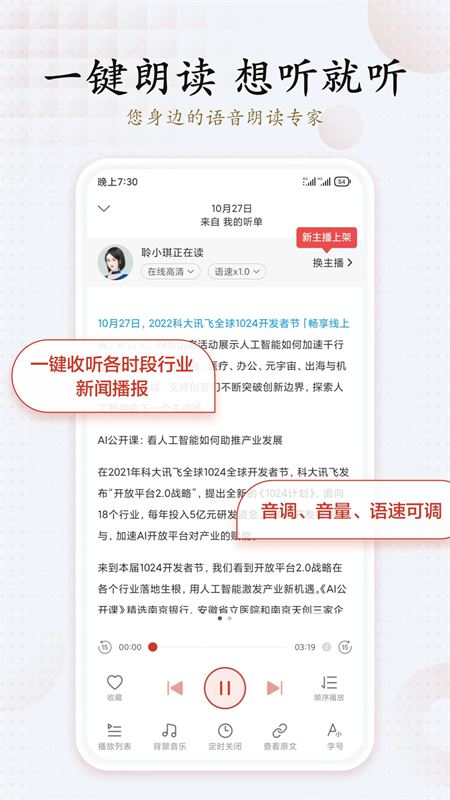 讯飞有声app是一款由科大讯飞推出的手机在线听书软件,这款软件支持导入各种格式的文档,能够帮助用户一键朗读各种文字。同时,该软件还采用了科大讯飞语音合成技术,不仅拥有多种声线可供选择,还支持用户个性化定制专属的个人主播。并且每一种声线都如同真人朗读一般,这样一来就能够给用户带来更加舒适、更加沉浸式的阅读体验。