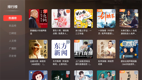喜马拉雅TV版是一款由喜马拉雅官方专门针对安卓智能电视打造而成的听书软件,这款软件拥有新闻谈话、相声评书小品、个性电台等丰富的内容,用户不仅可以在这里听到众多大师的经典相声、评书作品、文学解析等,还可以收听超多优秀的主播自制的电台节目,这样一来不仅能够很好的解放了双手、双眼而且能够更好的理解一系列文字更深层次的意义。