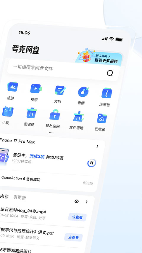 夸克网盘手机版是一款由阿里巴巴(中国)网络技术有限公司所推出的手机网盘软件,这款软件依托阿里云自研的智能存储和全球加速云网络技术打造而成,能够为用户提供了稳定、安全的云储存功能,用户在这里可以将一系列重要的文件、文档上传至网盘中,还可以使用软件备份手机中的照片、视频与音频,再也不用担心重要的文件会丢失。