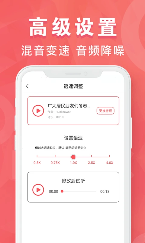 语音导出:在您的授权允许下此功能能够将手机磁盘中存储的常见社交平台的语音消息文件(amr和slk等)进行合并导出。 音频调速:调整音频播放速度,实现调快或者放慢音频的播放。