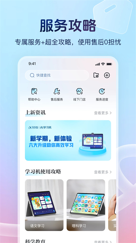 【我的】绑定并查看学习机设备、切换设备、解绑设备、寻求客服支持等。