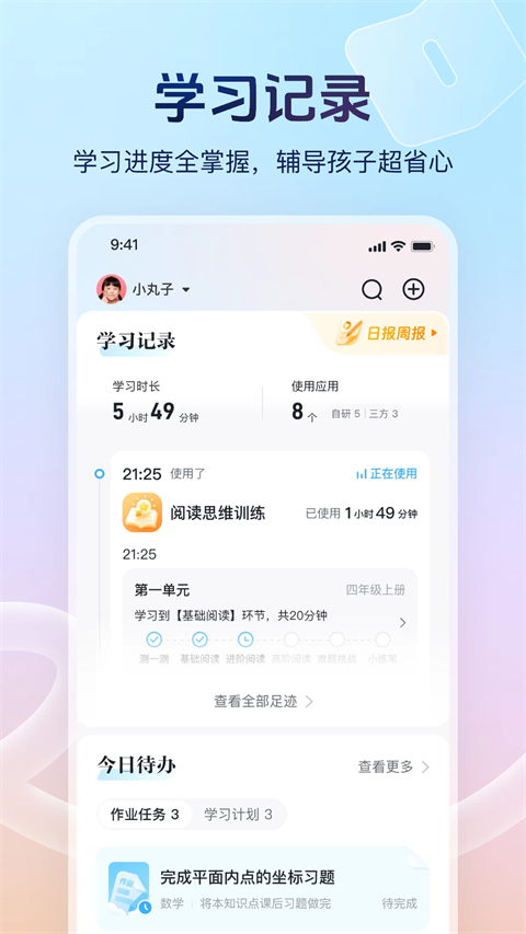 【学情】查看学习机中产生的各科目学习报告,包含日报、周报等。