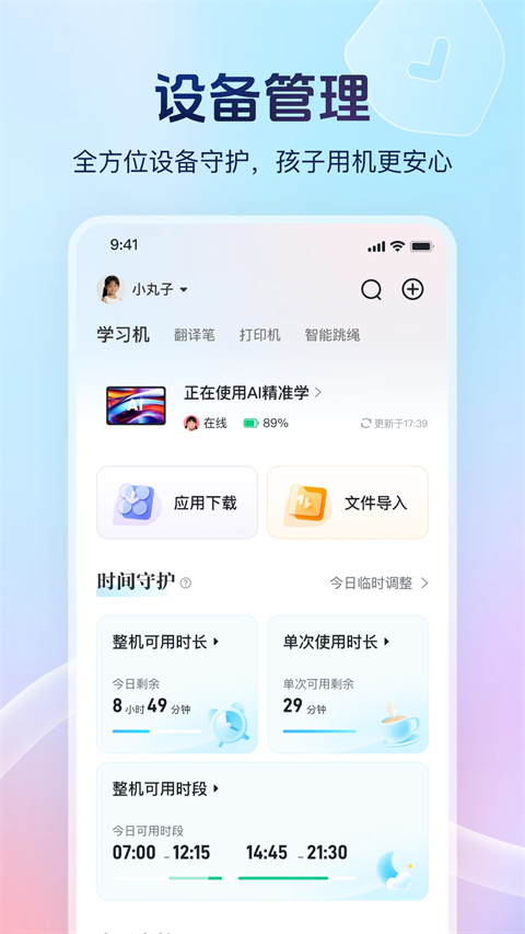 【管控】用户可使用各类管控功能实现对学习机设备的监管和控制,以防学习机的使用者将其过度用于娱乐用途,影响学习进度和效率。