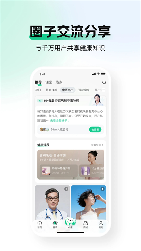 权威专家在线直播互动、参与答疑解惑,同时提供专业健康测评和健康咨询,并通过原创图文、视频等各种不同类型的健康科普知识,让用户轻松获取健康知识。