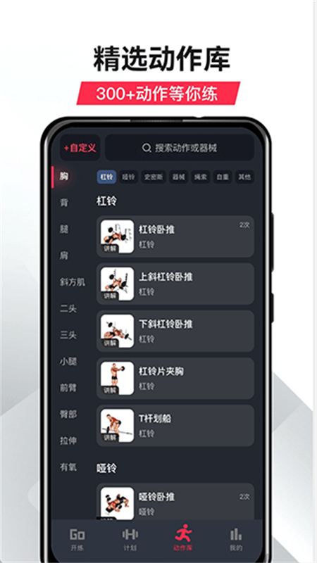 2、 动作库丰富:包含300多种常见fitness训练动作,涵盖各类健身器材,并持续更新扩展。还支持自定义动作。