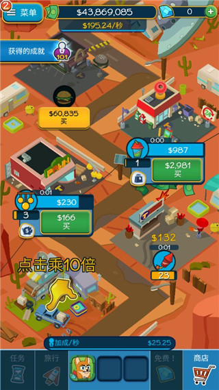 点击暴富游戏中我们点击商业楼房进行购买,购买之后它就会自动产生金钱,玩家们还可以点击该商业楼房将它升级,这样就会带给我们更多的利益。除了让楼房自动赚钱之外,我们点击自己的家园驻地可以手动产生金币,而且点击越快,收益就越高。本作以放置为中心,同时也加入了玩家手动点击功能,只需要快速点击屏幕即可获得有效资源。两种不同的金钱获取方式,自动还是手动完全由玩家自己决定,不过我还是觉得放着让它自己慢慢生钱就够了,真要一直点屏幕还不累死。