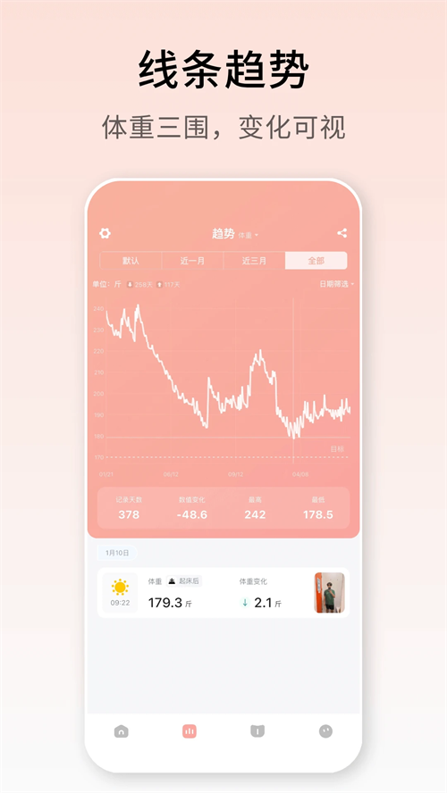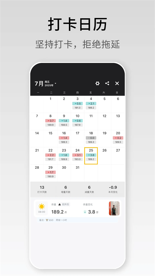 体重趋势、形体照片、健康状态、多种围度、记重日历一目了然。