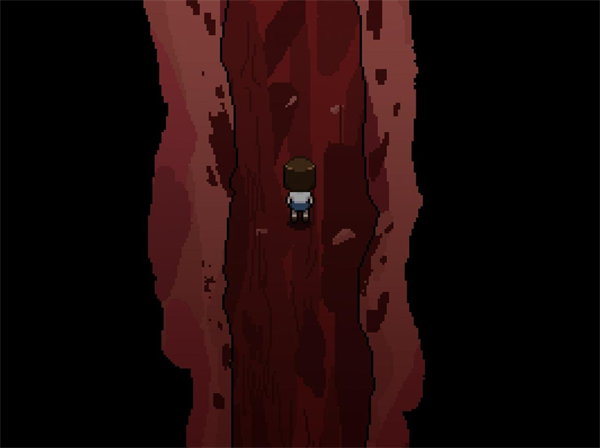 6、进入左侧房间F后击杀两只小怪物。调查上方有血的墙壁,进入隐藏房间一(乐园)。离开房间F回到通道E,右下进入房间G。房间G右下角存档点,有方块的地板为陷阱请绕行。