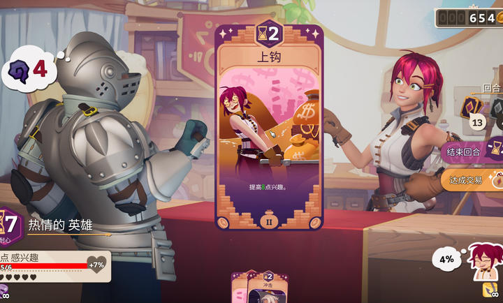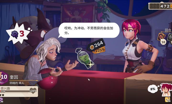 2、第一个是商人,商人NPC这里有一些基础的商品,其余的商品需要你探险获得,喂给他一份才能购买。商人这里的卡组主要是一些“交易”特质的,比如1费接下来几回合都造成伤害,或者是现在造成巨额伤害,但是有debuff。