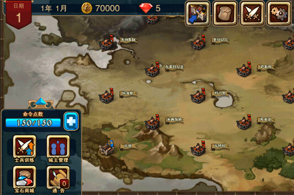 战斗胜利后我们有没有其他的事情可以做了呢?当然有了,我们可以发展城市,也就是说游戏分为战斗以及内政两个内容。其中发展城市有征兵、迁移、训练、开发、政治以及安抚这六个选项,征兵就是征募士兵,游戏中一共有五个兵种,其中低级兵种可以直接进行招募,高级兵种需要我们建造出相应的建筑才可以进行招募。此外游戏中每一次招募的数量都是有限制的,而且招募完成后还要冷却一段时间才可以继续进行招募,当然你可以使用宝石跳过冷却过程。