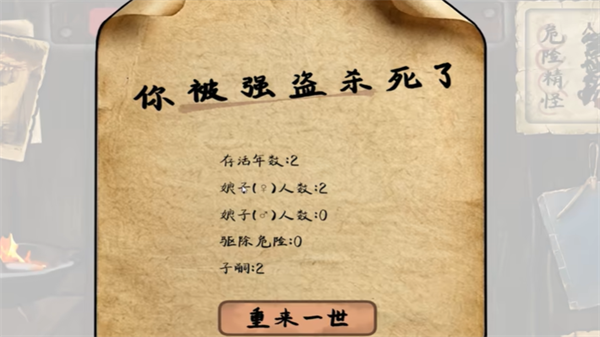 4、如果判断错误,就死了,系统会显示存活年数等数据,玩家可以选择重新开始或返回主界面。
