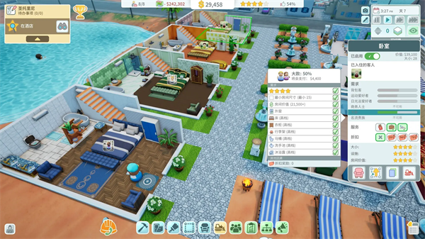 1、 多层建筑系统:支持多楼层建设,玩家可自由规划大堂、客房、餐厅、酒吧、泳池、桑拿房等功能区,并通过“实时建造”机制观察施工过程。