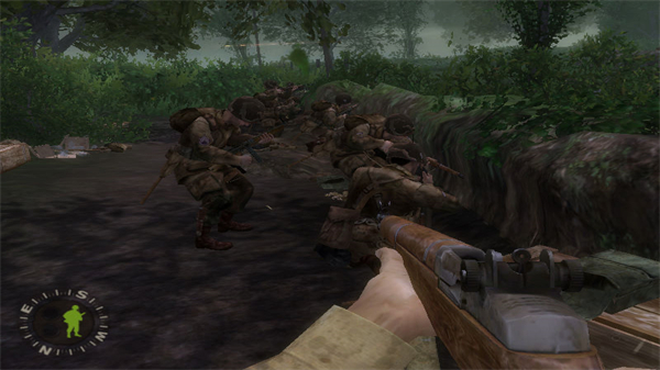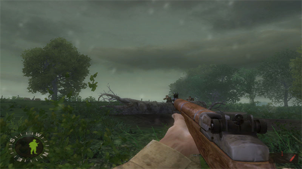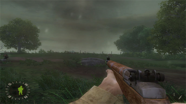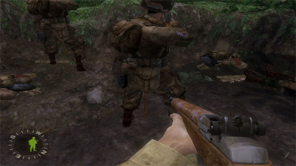 主人公每次出征只能携带两件主武器,通常合理配置是一步枪一冲锋枪。步枪中美制M1伽兰德、BAR都不错,后者威力大可快速连射,准星抖动幅度也小,只可惜出现比较晚。德军的K98步枪射速虽慢,但如果有安全位置仔细瞄准可达到相当高的命中率。冲锋枪最好一路都用德国货,美制汤姆森的20发弹匣根本不够,在战斗中玩家最好尽快换上缴获的MP40和后期出现的STG44。注意冲锋枪不是万能的,多数情况下还是步枪好使,如果你指挥得当甚至可自己一枪不发过关。缴获敌人武器时需要将准星对准地面上的枪械,得到系统提示后按住F键不放两三秒钟才能完成更换。对敌步兵的战斗中不推荐使用手雷,要想把这个铁疙瘩准确地投到敌人机枪工事中去很大程度上要靠运气。本作中手雷的最大用途是对付德军坦克,快步跑到敌坦克后方按F即可爬上炮塔塞入驾驶舱,仅需一发就能解决,比什么火箭筒都管用得多。