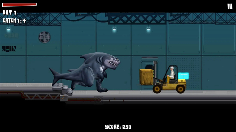 食人鲨横冲直撞破解无敌版是一款采用横版2D风格的动作冒险闯关类手游,这款游戏的故事发生在加利福尼亚红杉林中的一个秘密地下实验室里,而我们的玩家可以通过这款游戏来扮演一只结合了鲨鱼和恐龙基因的怪物,然后操控鲨鱼龙来逃离秘密实验室。当然,我们的玩家在逃离的过程中会遇到阻碍你逃跑的人类,我们可以将这些人类消灭掉。