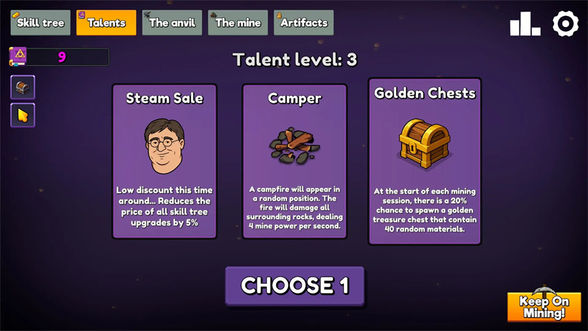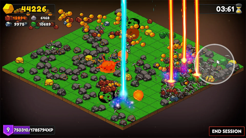 每次升级时,你都会获得一个天赋点。使用天赋点可以抽取3张随机天赋卡牌 — 从中选择一张保留!选择卡牌会提高天赋等级,但也会增加岩石的生命值。