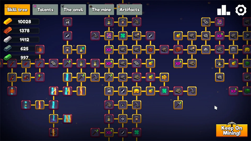 使用材料金属条在技能树中解锁升级。这些升级可永久提升属性,让你更有力地开采岩石!