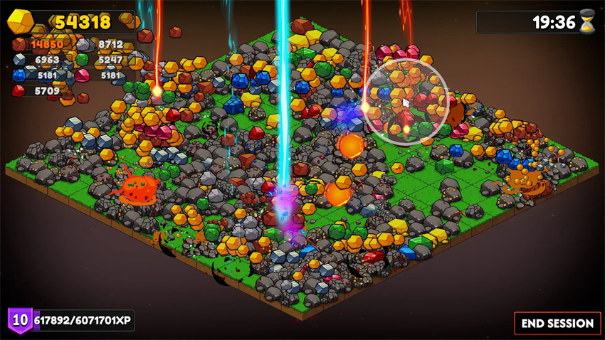 每块岩石碎裂时迸发差异化粒子特效,钻石矿会产生棱镜折射光效增强视觉成就感。