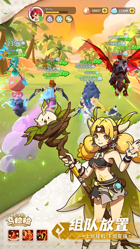 2、与以往放置游戏的单人挂机不同,《不休的乌拉拉》实现了和朋(基)友组队一起挂机的体验,可以拉现实中的朋(基)友一起组队,当然也可以在游戏中认识其他新的朋(基)友一起组团PK。