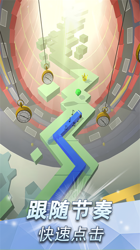 更多的障碍物随机的出现,掌握音乐的节奏进行躲避,突破手速极限。