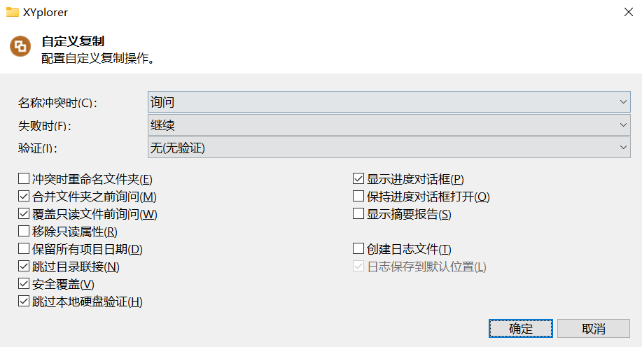 自定义复制:要使用XYplorer自带的高级复制程序,请勾选 配置|文件操作|文件操作|自定义复制操作|使用自定义复制。你将得到速度,名称冲突选项,验证选项,加上一个可选的进度界面与最终报告。