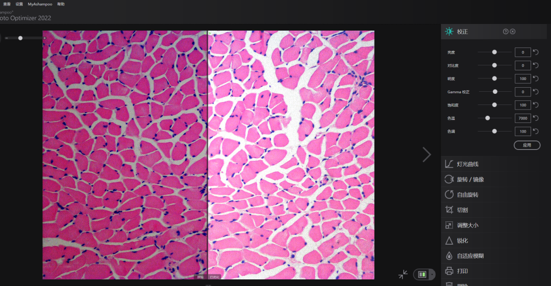 小虎编辑这里以HE染色的切片为例,因为在使用显微镜拍摄的过程中,每次观测条件不同,显微镜状态也不同,所以获得的图片,经常存在颜色不一样的情况。这里左侧的原图偏黑,整体灰暗,经过小虎编辑调整亮度、对比度和灯光区先后,可以看出整个切片中的颜色发生了很大的变化,很多细节也都能体现出来。整个操作也就几秒钟的时间,Photo Optimizer 2026可谓是不可多得的调色神器了。